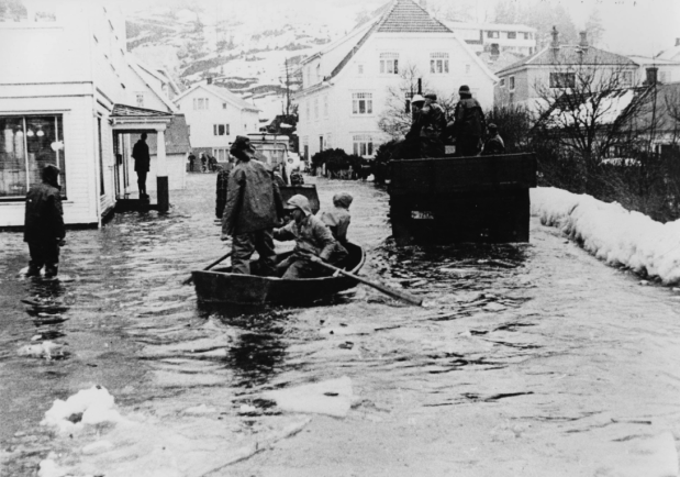 Det har vore flaumar og våte vintrar tidlegare òg, men i framtida vil slike hendingar skje oftare og med større omfang. Biletet er frå ein flaum i Hauge i Dalane vinteren 1970, og høyrer til Dalane Folkemuseum si fotosamling.