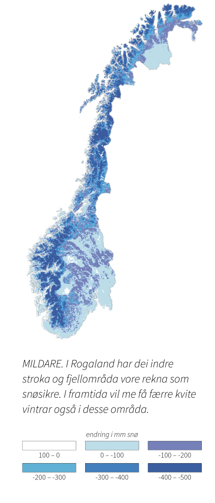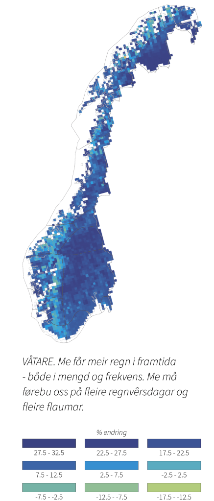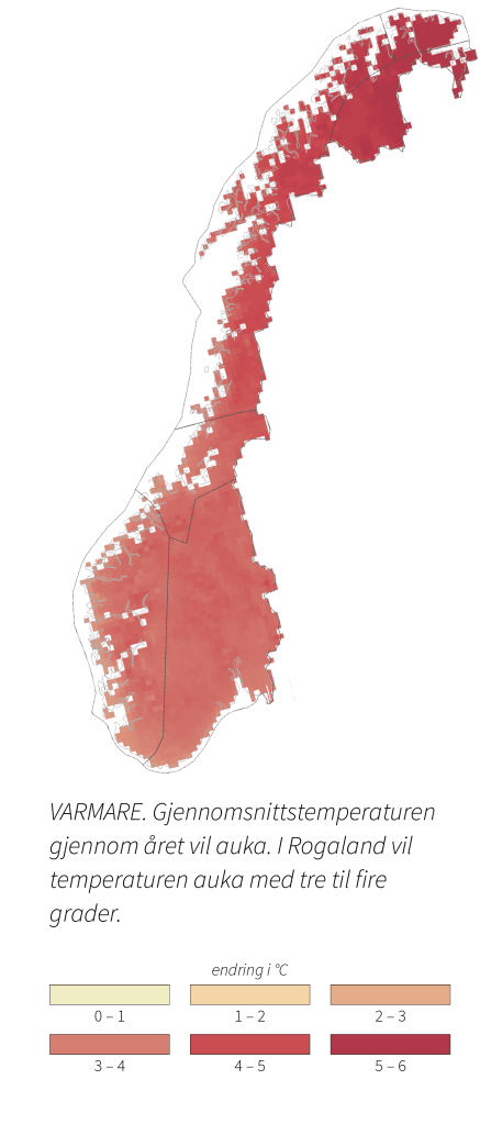 Klimaframskrivingar viser kva klima me kan venta oss i framtida. Karta varslar vêret for 1971-2100. Endringa er jamført med klimadata for perioden 1971-2000. Kjelde: Norsk klimaservicesenter.