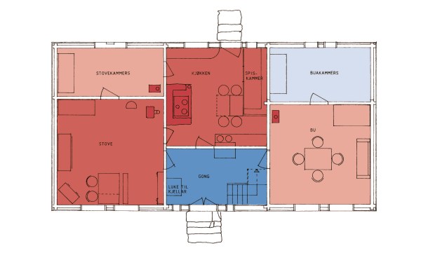 Romma som blei varma opp kvar dag er vist som mørk raude, medan dei romma som sjeldnare blei varma opp er lysare raude. Gang og kammers var kalde rom (blå). Huset som er vist her er stovehuset på Kolbeinstveit, eigd av Ryfylkemuseet.