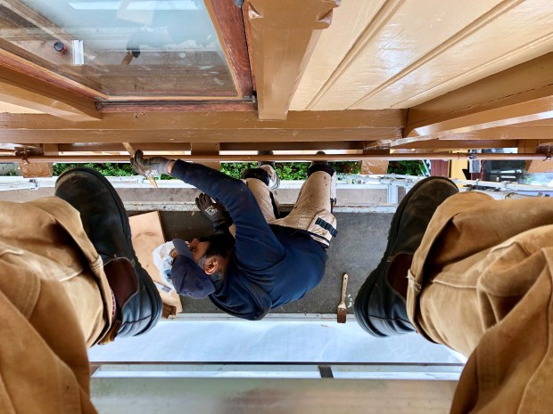 På villaen Breidablikk var det ikkje mangel på overflatebehandling som var problemet, heller omvendt: Mange og tjukke lag med tett maling gjorde at veggen ikkje lenger fekk pusta, og dette førte til fukt og roteskadar. Museum Stavanger måtte difor fjerna dei tjukke laga med maling, for så å byggja opp att med linoljemaling i fleire tynne strok. Foto: Mathies Ekelund Erlandsen / Museum Stavanger.