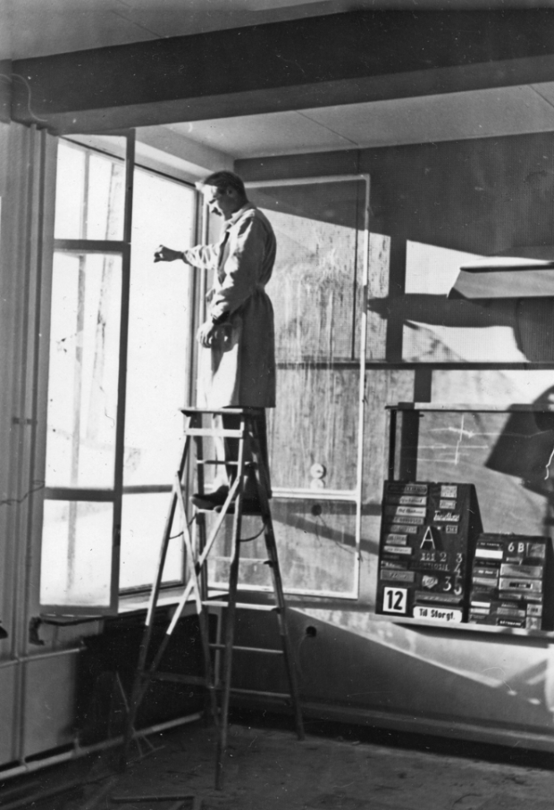 Innvendige glas i vindauga er ei løysing ein finn i mange eldre hus. Biletet her er frå bygginga av midtbygget på Hauge skule i Haugesund, cirka år 1955. Dei store sidehengsla varevindauga står opne. Foto: Haugalandmuseet.